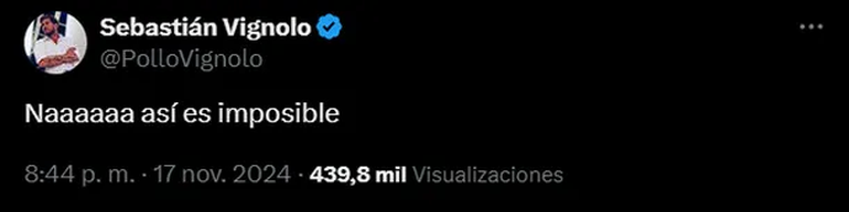 Sebastián el Pollo Vignolo, el reconocido periodista de ESPN e hincha confeso de All Boys, expresó su indignación a través de las redes sociales, donde disparó en su cuenta oficial de X (ex Twitter): “Naaaaaa así es imposible”, en clara alusión a la situación que perjudicó a su equipo.
