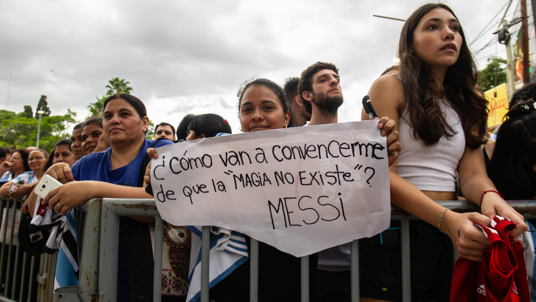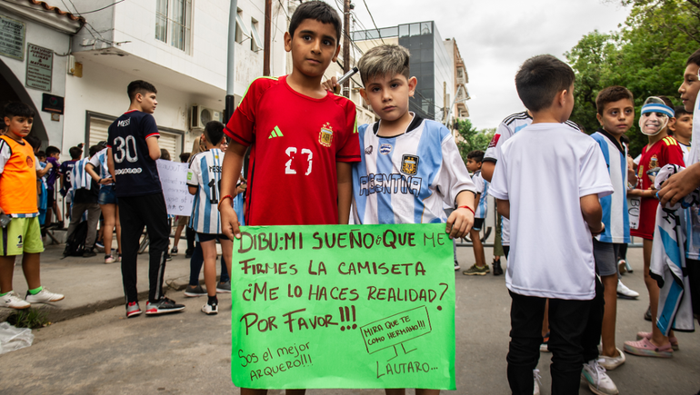 Messi y Dibu Martínez son dos de los más solicitados y queridos por el público. "Como van a convencerme de que la magia no existe", dice otro de lo carteles, haciendo referencia al "10", mientras que dos hermanos piden por la firma del Dibu en otro de los letreros.