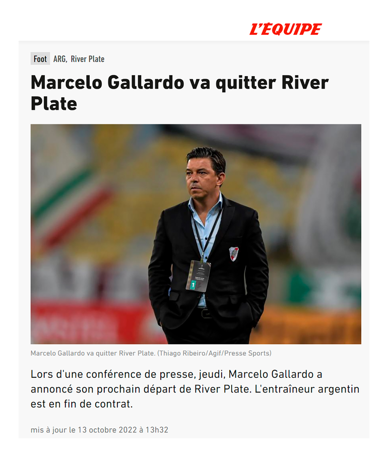 En la misma tónica siguieron los portales de Barcelona, Mundo Deportivo y Sport. Luego, el prestigioso portal francés de L'Equipe también puso entre sus principales títulos la salida de Gallardo, quien tuvo dos pasos como futbolista en dicho país en PSG y Mónaco.