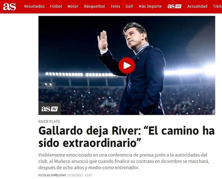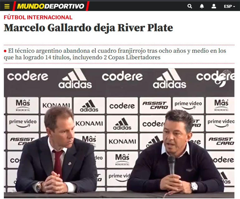 Los portales de As y Marca, los principales medios deportivos de Madrid, fueron los primeros que publicaron la noticia en sus portales online. "Gallardo deja River: 'El camino ha sido extraordinario'", tituló As, mientras que en Marca escribieron: "Bombazo en Argentina: el técnico argentino Marcelo Gallardo ha anunciado en el día de hoy en una conferencia de prensa que no seguirá siendo entrenador de River Plate, club al que llegó en el año 2014".