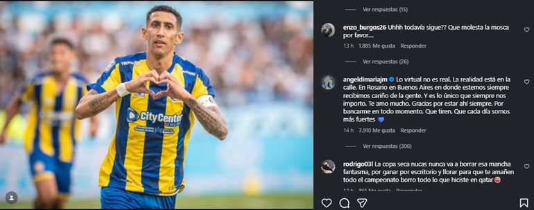 Ante ese posteo, Di María contestó: "Lo virtual no es real. La realidad está en la calle. En Rosario en Buenos Aires en donde estemos siempre recibimos cariño de la gente. Y es lo único que siempre nos importó".
