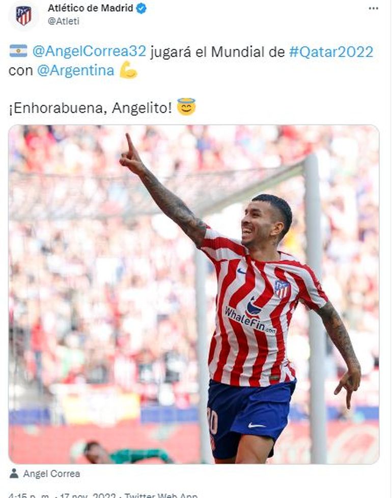 Atlético Madrid también se hizo eco de la convocatoria de Correa y felicitó al futbolista a través de las redes sociales.