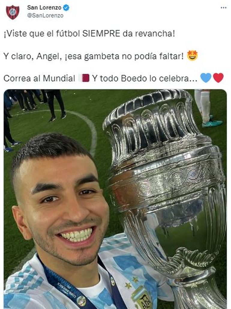 Su nueva convocatoria, en reemplazo del lesionado González, fue celebrada por San Lorenzo que desde su cuenta oficial de Twitter escribió: "¡Viste que el fútbol SIEMPRE da revancha! Y claro, Ángel, ¡esa gambeta no podía faltar! Correa al Mundial Y todo Boedo lo celebra...".