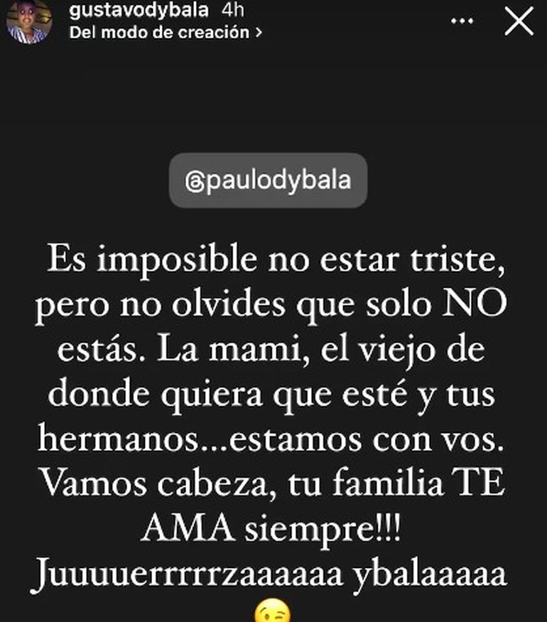 Sumado al relato de su compañero, el hermano de la joya, Gustavo Dybala, escribió un fuerte mensaje en sus redes sociales con respecto a la decisión que tomó el entrenador nacido en Pujato: “Es imposible no estar triste, pero no olvides que solo no estás. La mami, el viejo desde donde quiera que esté y tus hermanos estamos con vos. Vamos, cabeza. Tu familia te ama siempre. Juerza, Ybala”.