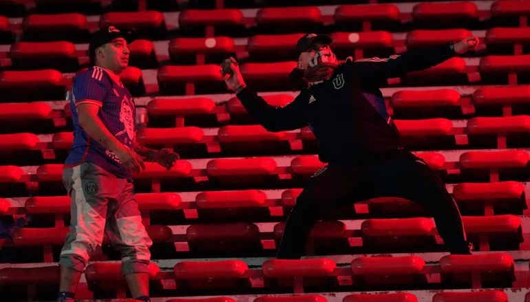 Durante la primera mitad y el entretiempo, los hinchas de la “U” arrojaron proyectiles hacia el sector local, rompieron butacas y dañaron la mampostería de la tribuna Pavoni Alta. Además, iniciaron un pequeño foco de incendio y lanzaron billetes a modo de provocación hacia la bandeja inferior donde se encontraban simpatizantes del equipo argentino.