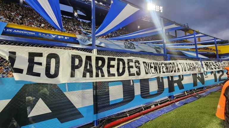 “La 12”, ubicada en la Popular Norte de La Bombonera, le dejó un mensaje al surgido de las inferiores de la institución. "Leo Paredes, bienvenido a tu casa. Jugador Número 12", se leía en un trapo blanco.