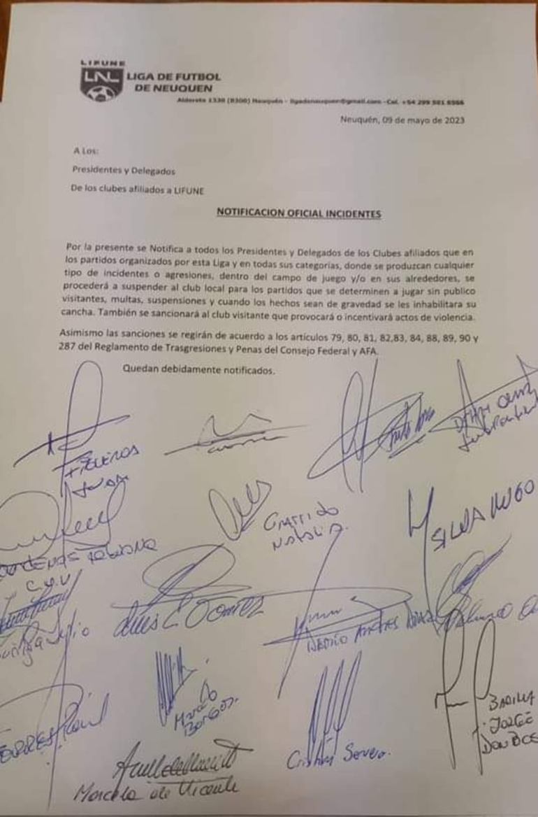 "Por la presente se notifica a todos los Presidentes y Delegados de los clubes afiliados que en los partidos organizados por esta Liga y en todas sus categorías, donde se produzcan cualquier tipo de incidentes o agresiones, dentro del campo de juego y/o en sus alrededores, se procederá a suspender al club local para los partidos que se determinen a jugar sin público visitante, multar, suspensiones, y cuando los hechos sean de gravedad se les inhabilitará su cancha.
