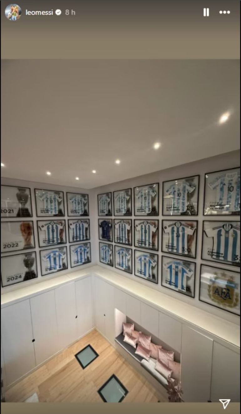 Luego de cumplirse un nuevo aniversario de campeones del mundo, el pasado 18 de diciembre, el 10 compartió una storie en su cuenta de instagram dando a conocer un rincón íntimo pero colmado de gloria que posee en su hogar rosarino. Leo hizo honor a los triunfos conseguidos con la albiceleste y lo compartió con sus más de 500 millones de seguidores que, seguramente, habrán likeado la storie en cifras innumerables y, también, rememorando cada momento que representan las camisetas colgadas allí, sobre todo, el escudo de AFA con las tres estrellas.