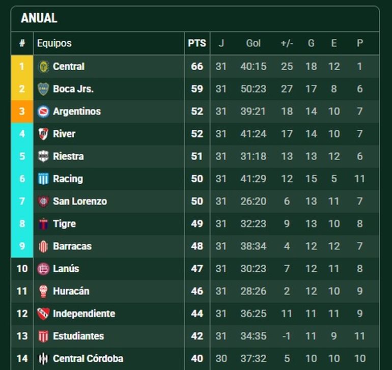 El equipo de Marcelo Gallardo suma 52 puntos, detrás de Central (66) y Boca (59), mientras que Riestra quedó con 51