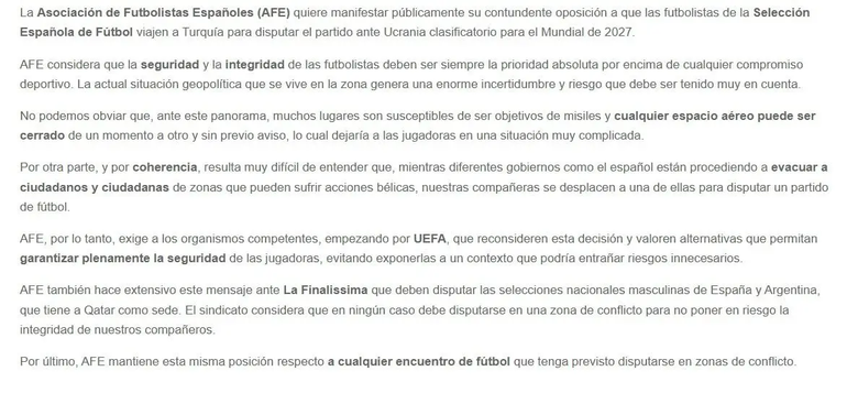 La Asociación de Futbolistas Españoles se expresó en su página web oficial y sostuvo que el mencionado sindicato "considera que en ningún caso debe disputarse en una zona de conflicto para no poner en riesgo la integridad de nuestros compañeros". Estas declaraciones van en línea con lo que dijo Luis de la Fuente, DT de la "Furia Roja" días atrás. "La solución sería, entiendo, que mientras no se pueda jugar allí se busque otra sede si es posible. Eso es un poco por donde va toda la negociación". En el comunicado de la AFE también mostraron la misma opinión con respecto a un partido clasificatorio para el Mundial femenino ante Ucrania a jugarse en Turquía.