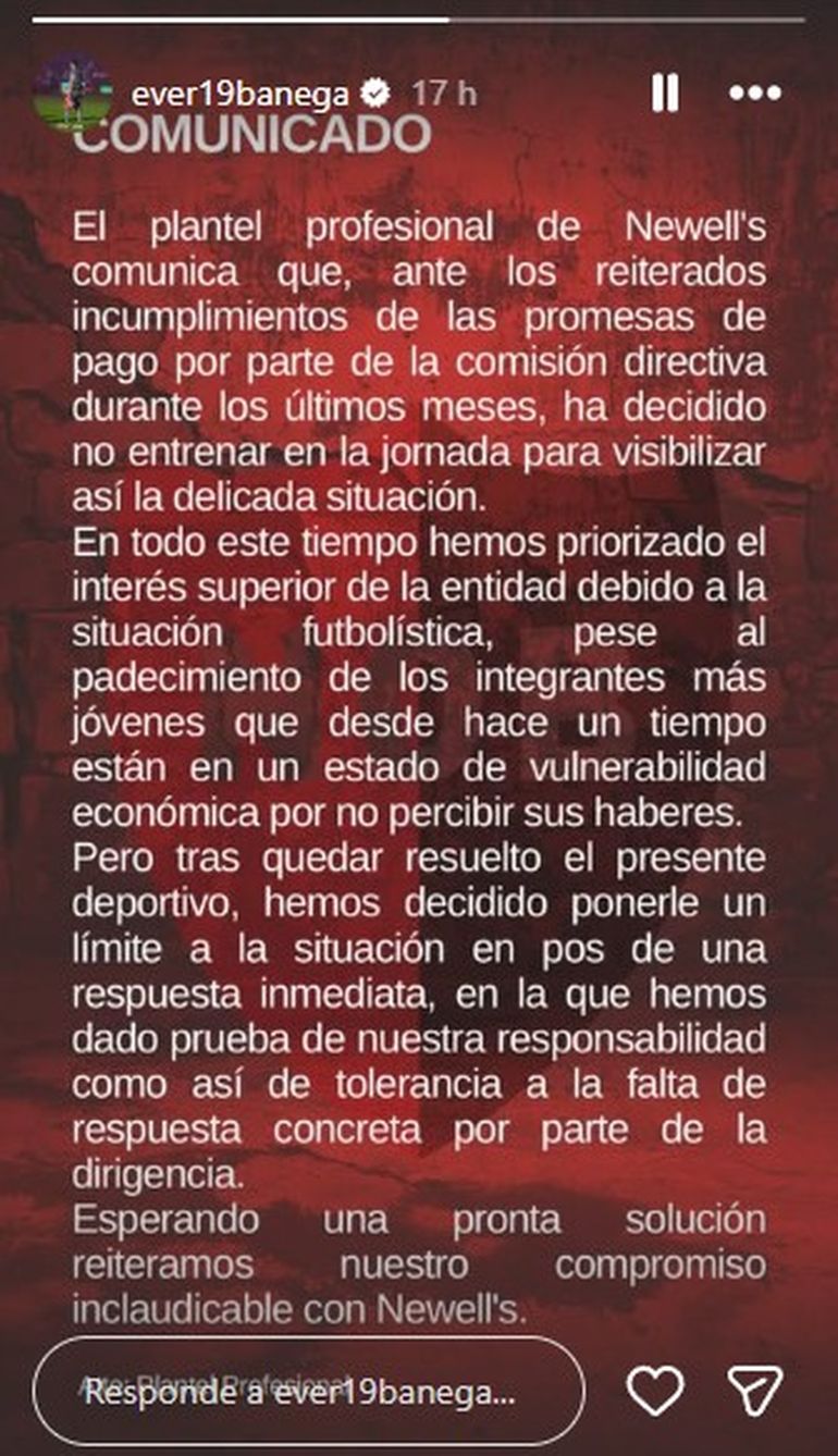 "El plantel profesional de Newell's comunica que, ante los reiterados incumplimientos de las promesas de pago por parte de la comisión directiva durante los últimos meses, ha decidido no entrenar en la jornada para visibilizar así la delicada situación. En todo este tiempo hemos priorizado el interés superior de la entidad debido a la situación futbolística, pese al padecimiento de los integrantes más jóvenes que desde hace un tiempo están en un estado de vulnerabilidad económica por no percibir sus haberes. Pero tras quedar resuelto el presente deportivo, hemos decidido ponerle un límite a la situación en pos de una respuesta inmediata, en la que hemos dado prueba de nuestra responsabilidad como así de tolerancia a la falta de respuesta concreta por parte de la dirigencia. Esperando una pronta solución reiteramos nuestro compromiso inclaudicable con Newell's".
