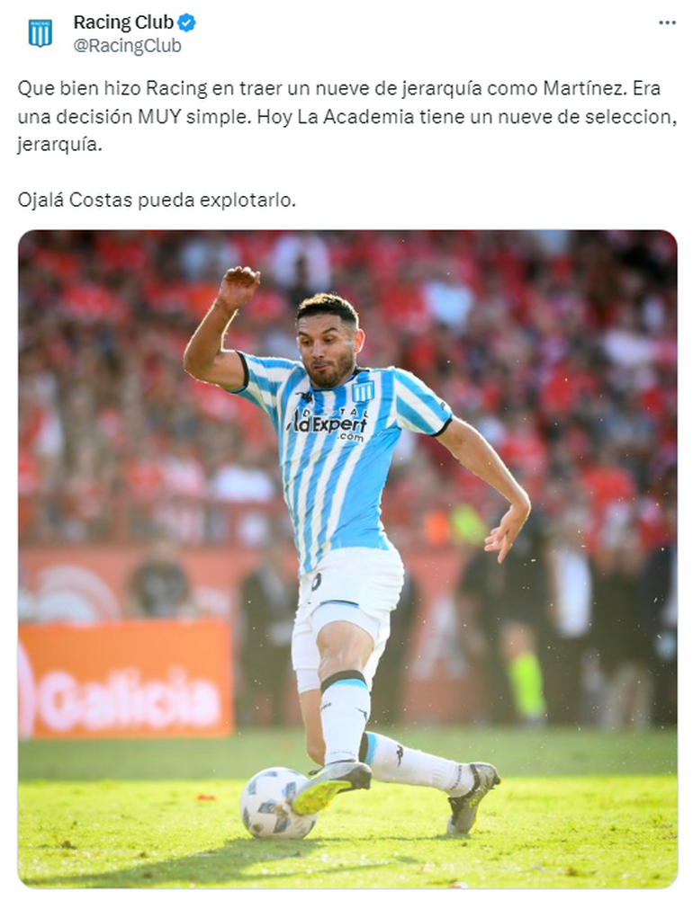 La Academia se impuso por 1 a 0 en una nueva versión del clásico de Avellaneda con gol de Adrián 'Maravilla' Martínez, quien estuvo cerca de jugar en el Rojo, aunque la dirigencia finalmente optó por llevar al ex Argentinos Juniors, Gabriel Ávalos. Este fue el primer motivo de cargada, desde las propias redes oficiales de Racing.