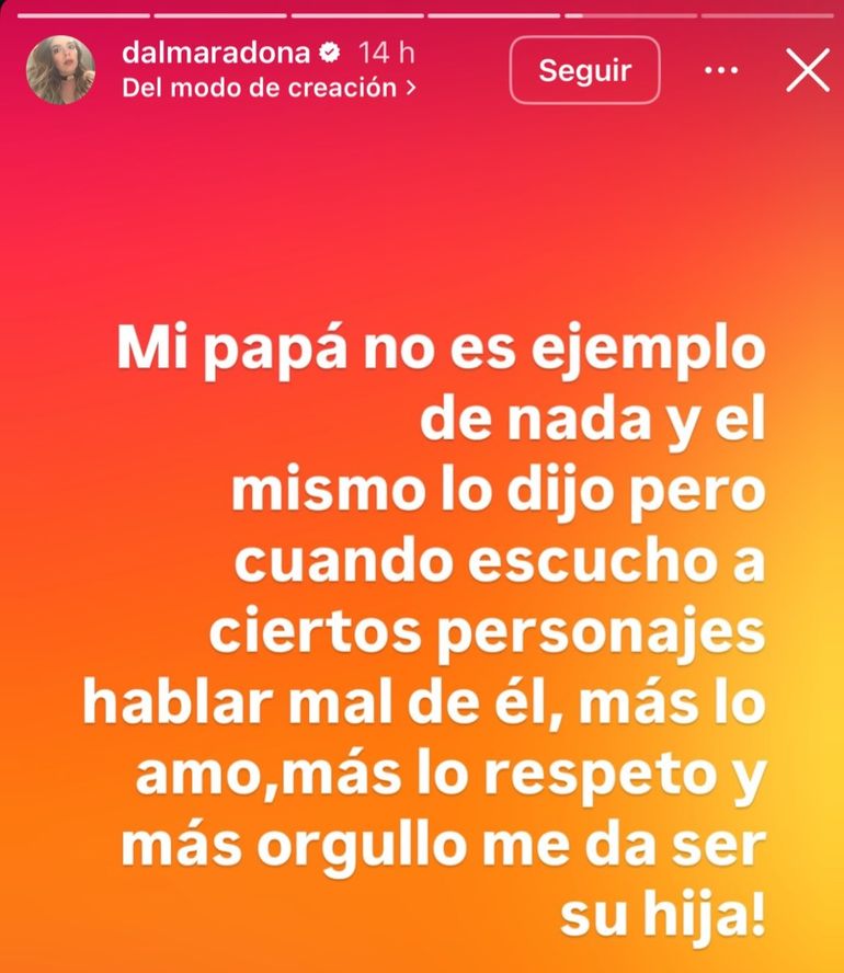 “Mi papá no es ejemplo de nada y él mismo lo dijo pero cuando escucho a ciertos personajes hablar mal de él, más lo amo, más lo respeto y más orgullo me da ser su hija”, sentenció.
