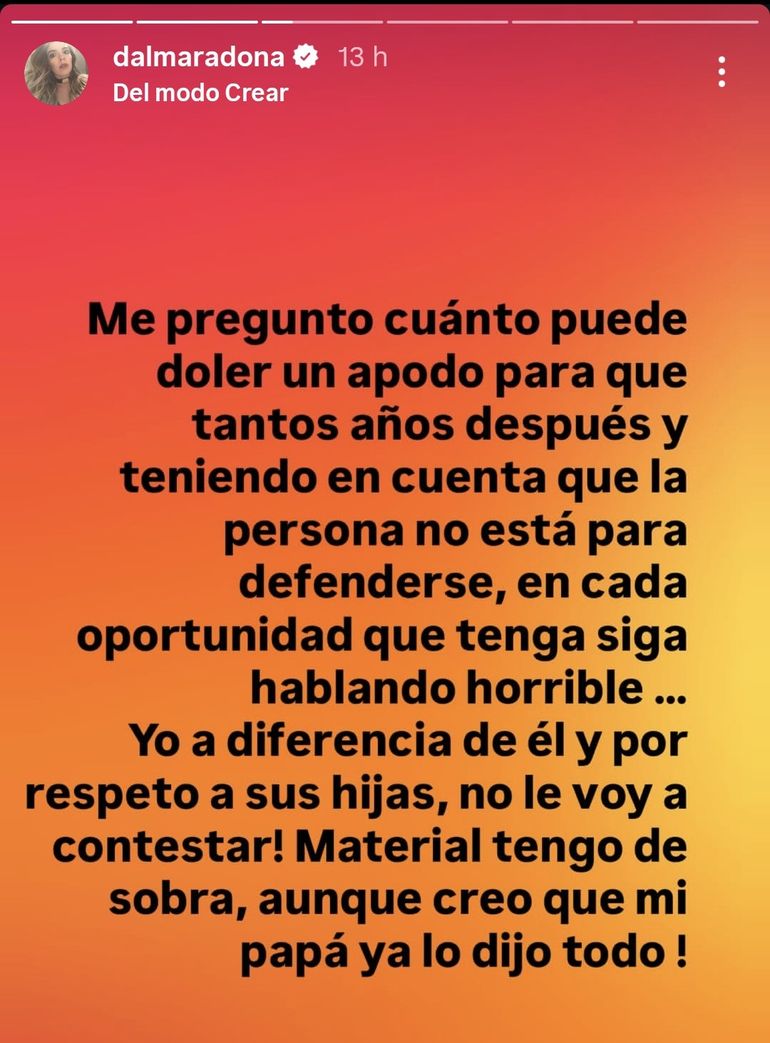 Luego, la actriz apuntó que “yo a diferencia de él y por respeto a sus hijas, no le voy a contestar! Material tengo de sobra, aunque creo que mi papá ya lo dijo todo. No va a ser el primero ni el último que habla mal de mi papá ahora y cuando lo tenía en frente se le fruncía el culo! Obvio que cada uno puede opinar de lo que quiera pero me da bastante risa de parte de quien viene!”, añadió.
