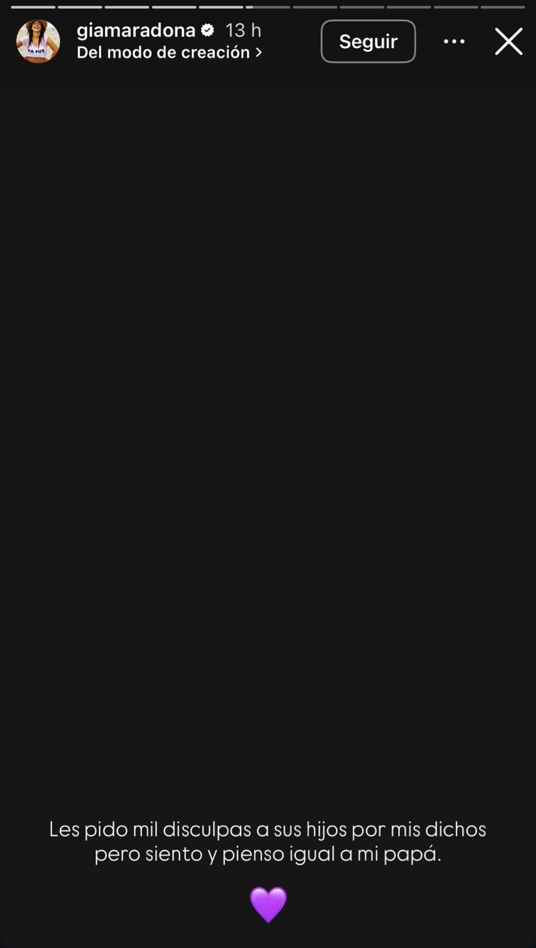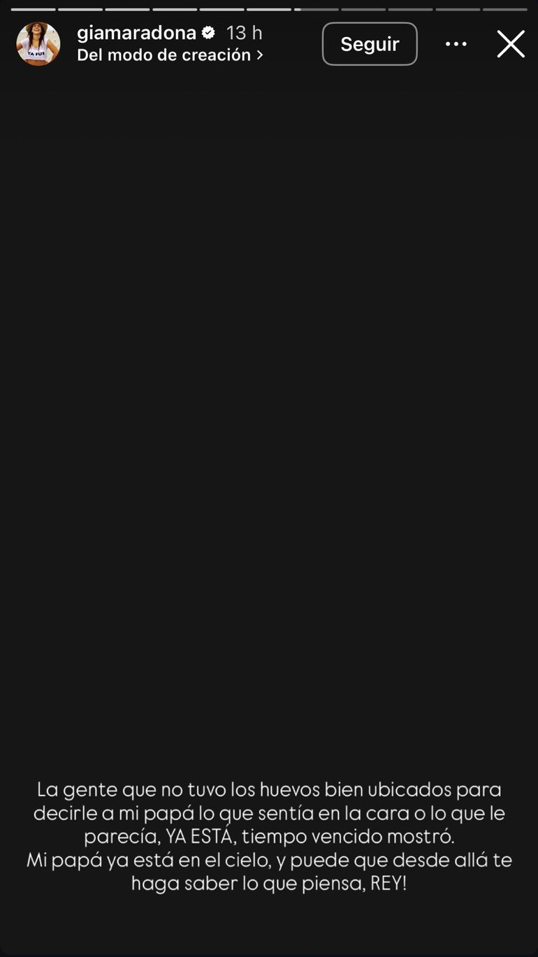“Les pido mil disculpas a sus hijos por mis dichos pero siento y pienso igual que mi papá. La gente que no tuvo los huevos bien ubicados para decirle a mi papá lo que sentía en la cara o lo que le parecía, ya está, tiempo vencido mostró. Mi papá ya está en el cielo, y puede que desde allá te haga saber lo que piensa, rey”, finalizó.