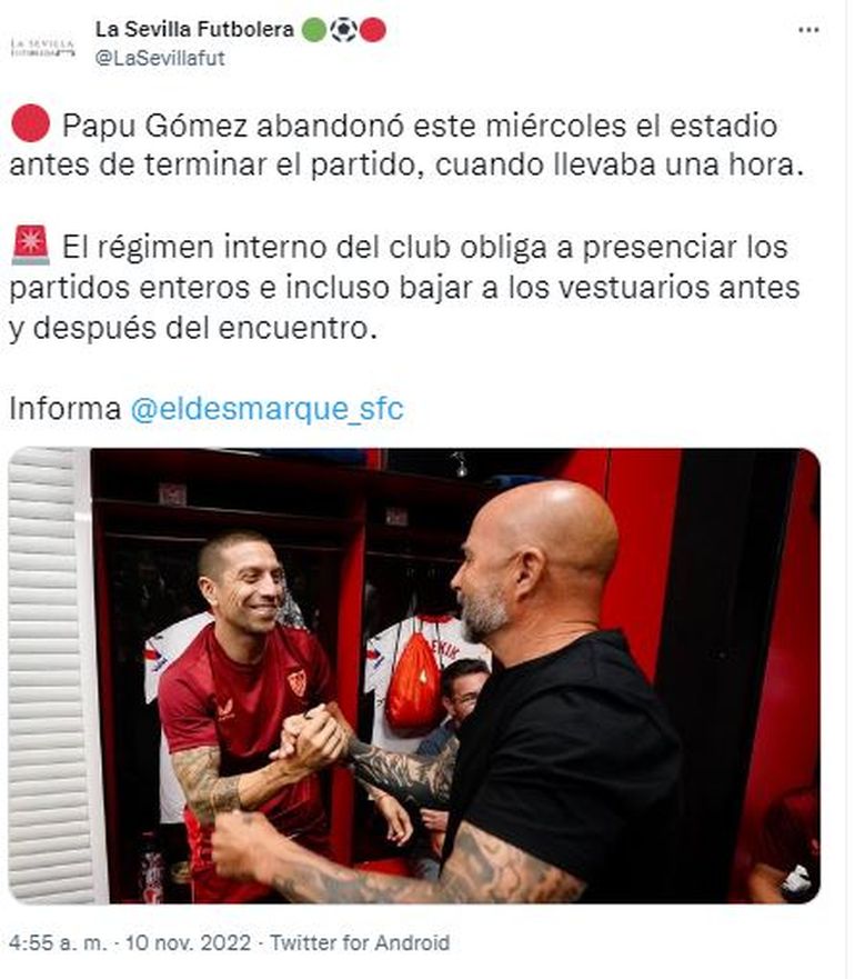 Gómez, quien al igual que sus compañeros Marcos Acuña y Gonzalo Montiel se incorporarán en pocas horas al seleccionado argentino en Qatar, fue criticado duramente en los medios andaluces por no esperar el final del partido ni presentarse en el vestuario a despedirse de sus compañeros.