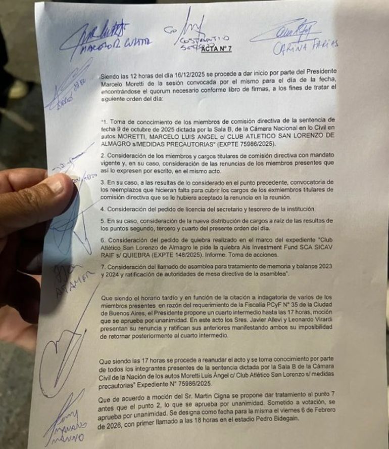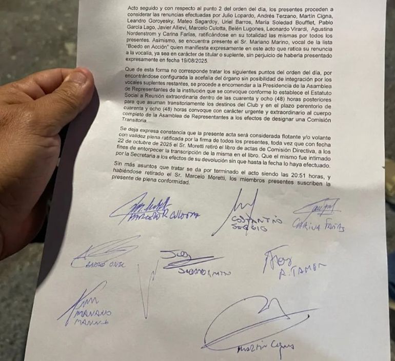 Luego de la reunión convocada por el presidente de la institución, donde solamente siete directivos no renunciaron a su lugar mientras que otros 14 si, se conoció que el acta de la reunión no cuenta con la firma de Moretti. A su vez, se deja expreso que el mismo "retiró el libro de actas de Comisión Directiva, a los fines de entorpecer la transcripción de la misma en los libros".