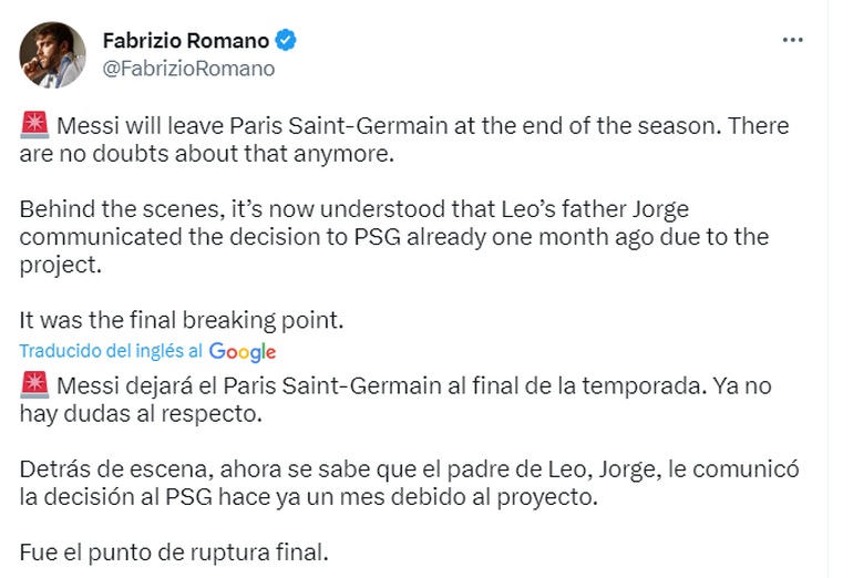 El periodista Fabrizio Romano, uno de los más confiables en cuanto a información de pases se refiere, publicó un twit que certifica la salida de Lionel del PSG.
