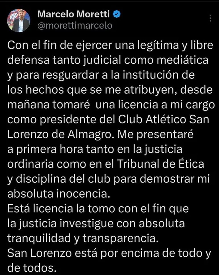 Moretti, quien aseguró que todo esto se trata de una operación en su contra y que los 25 mil dólares que recibió fueron una donación para el club, pidió una licencia en el cargo “con el fin de ejercer una legítima y libre defensa tanto judicial como mediática y para resguardar a la institución de los hechos que se meatribuyen”.