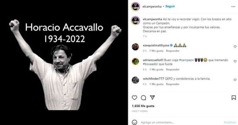 "Así te voy a recordar viejo!. Con los brazos en alto como un Campeón. Gracias por tus enseñanzas y por inculcarme tus valores. Descansa en paz", escribió Horacio Accavallo Jr. junto a una foto de su padre en su cuenta de la red social Instagram.