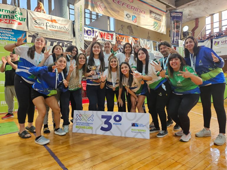 Los festejos continuaron en el otro extremo, en la ciudad de San Carlos de Bariloche, con el voley femenino que también se colgó la presea de bronce, luego de un partido largo que se definió en el tie break jugado punto a punto y que se cerró con la victoria del Verde por 23-25, 25-22, 20-25, 25-21 y 15-13 ante Bio Bio.