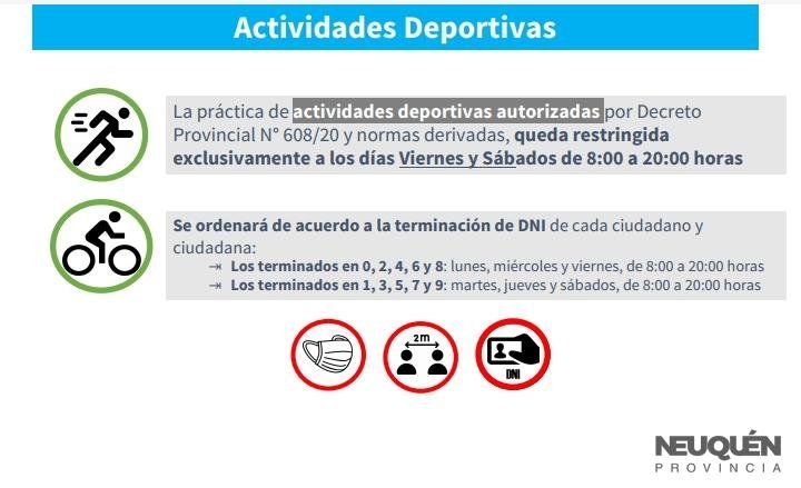 "La práctica de actividades deportivas autorizadas por Decreto Provincial N°608/20 y normas derivadas, queda restringida exclusivamente a los días viernes y sábados de 8 a 20 horas", explica el texto.