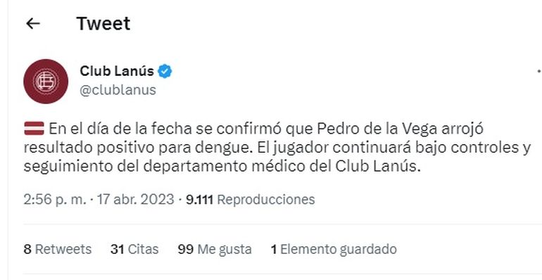 Tras el caso de Mateo Irala, de San Lorenzo, hoy se confirmó el contagio de Pedro De la Vega, mediocampista ofensivo de Lanús. El rubio estaba en observación desde el jueves pasado.