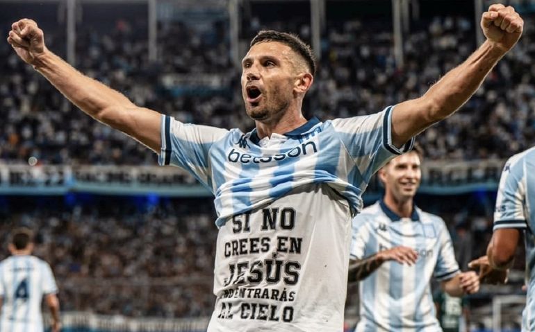 "Si no crees en Jesús, no encontrarás el cielo", decía su camiseta por debajo de la de Racing, a la cual mostró después de marcar.