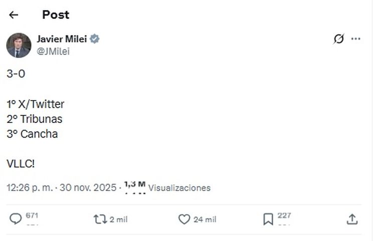 En aquella oportunidad, Milei había publicado un mensaje en el que, sin nombrarlo, hacía referencia al “Chiqui” Tapia. “3-0″, escribió en referencia a los cánticos en contra el máximo dirigente del fútbol argentino que se volvieron virales en las canchas en repudio a la copa entregada a Rosario Central justificada por las autoridades de la AFA por tratarse del equipo con mayor cantidad de puntos obtenidos en el año.