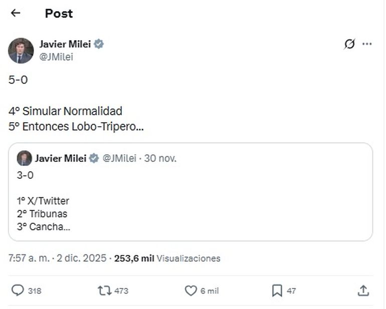 Este martes, Milei citó ese twit que había subido el domingo y agregó: “5-0. 4° Simular normalidad, 5° Entonces Lobo-Tripero...”.