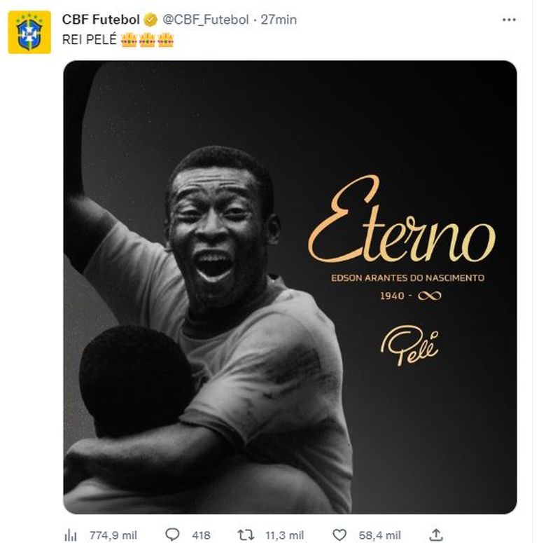 "Todo lo que somos es gracias a vos. Te amamos infinitamente. Descansá en paz", publicó la hija de Pelé, quien había sido internado a fines de noviembre a raíz de un agravamiento general de su estado de salud por un cáncer de colon.