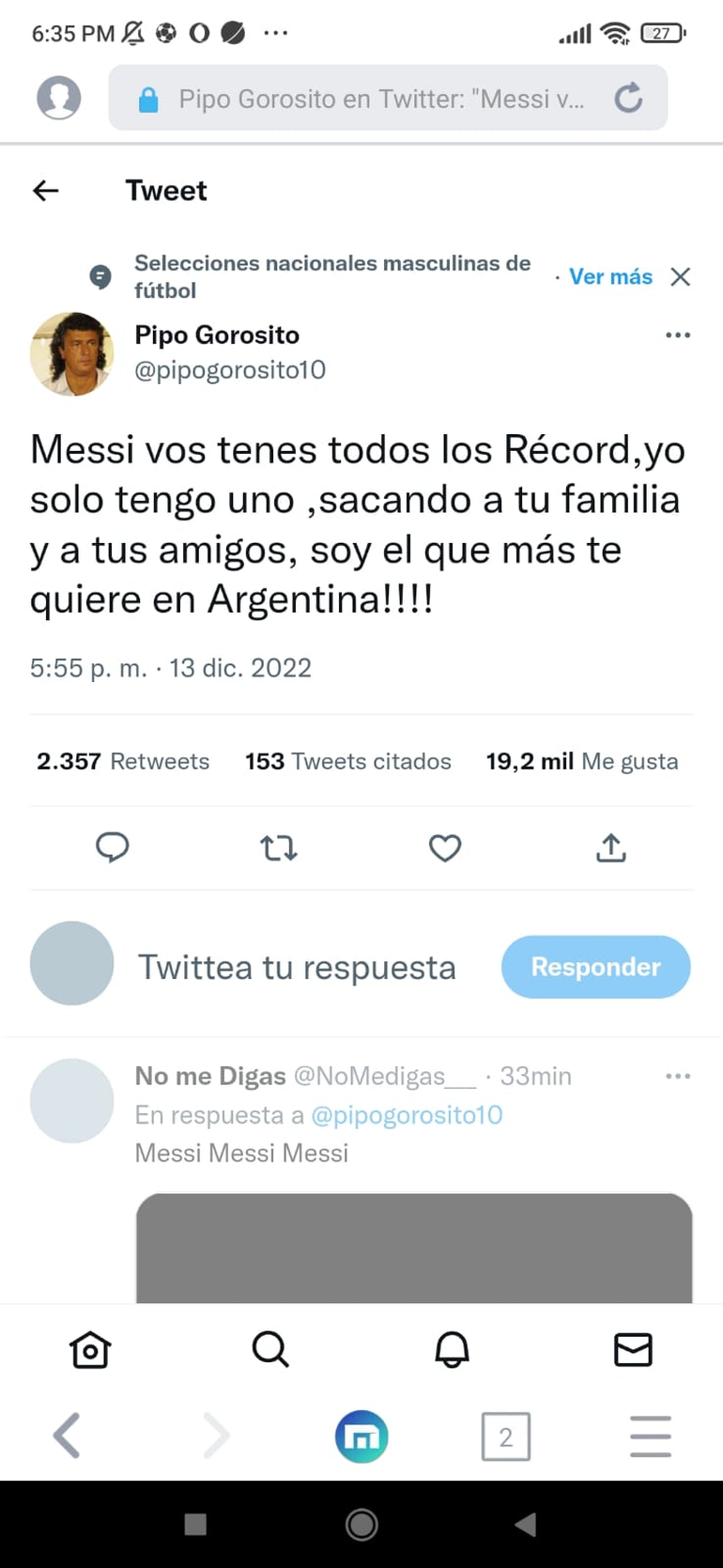 Luego se preguntó en otro tuit irónico: "Messi, nos llevaste a 3 finales de América y a 2 finales del mundo, pero ahora jugás bien porque cantás el himno !!!! Que dirán "los bobos"!!!!!".