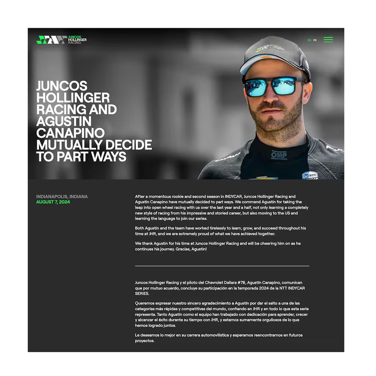 La propia escudería lanzó un comunicado en sus redes sociales, donde explicó: “Juncos Hollinger Racing y el piloto del Chevrolet Dallara #78, Agustín Canapino, comunican que por mutuo acuerdo, concluye su participación en la temporada 2024 de la NTT INDYCAR SERIES”.