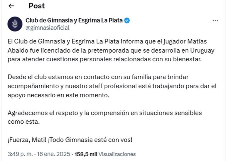 “El Club Gimnasia y Esgrima de La Plata informa que el jugador Matías Abaldo fue licenciado de la pretemporada que se desarrolla en Uruguay para atender cuestiones personales relacionadas con su bienestar”, reveló Gimnasia y Esgrima de La Plata en su comunicado oficial.