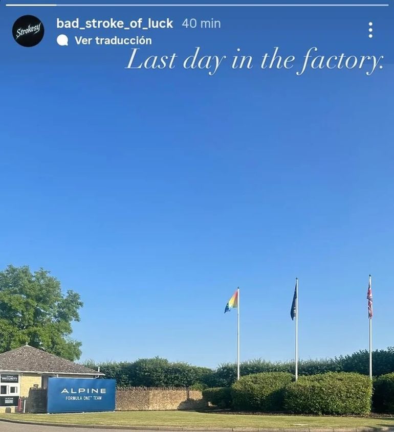 Francis J.S., nombre con el que se lo conoce en redes sociales, acaba de postear una historia de Instagram mostrando una imagen de la sede que Alpine tiene en Enstone, Reino Unido, en la que destacó: “Mi último día de trabajo en la fábrica”.