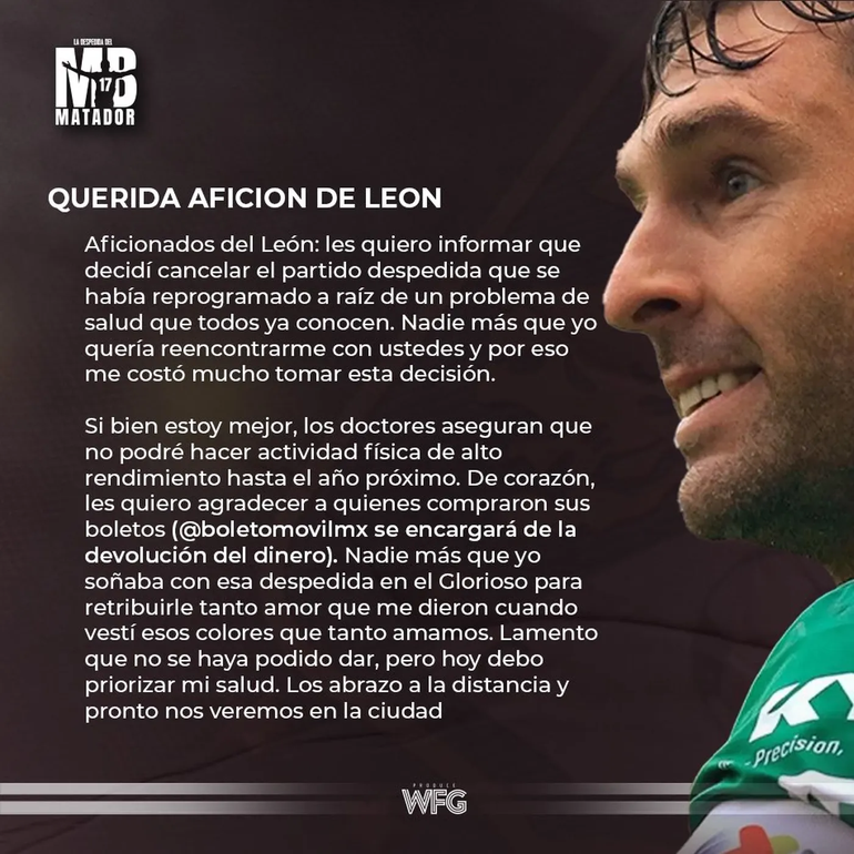 Mediante un comunicado oficial, expresó: “Aficionados del León: les quiero informar que decidí cancelar el partido despedida que se había reprogramado a raíz de un problema de salud que todos ya conocen. Nadie más que yo quería reencontrarme con ustedes y por eso me costó mucho tomar esta decisión”.