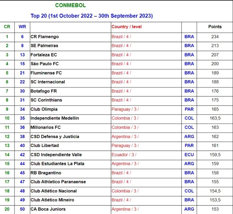En lo que respecta al resto de los equipos argentinos, detrás de los mencionados se encuentra Racing en la posición 51, con 151 puntos y San Lorenzo en el puesto 64 con 142,5 puntos. Por su parte, River quedó en el puesto 67, con 139,5 puntos, ya que la eliminación en octavos de final lo llevó a decaer en este ranking mundial.