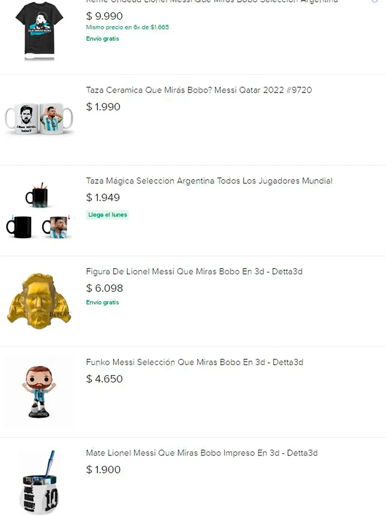 Ahora, esta misma frase del astro ya está disponible y a la venta en remeras, mates, gorras y hasta accesorios para la computadora, una clara muestra de la inventiva criolla y de la veneración al Diez. En Mercado Libre hay una gran variedad de objetos ploteados con “qué mirás, bobo” y la cara de Lionel Messi disponibles para todos los gustos y con una gran gama de precios.