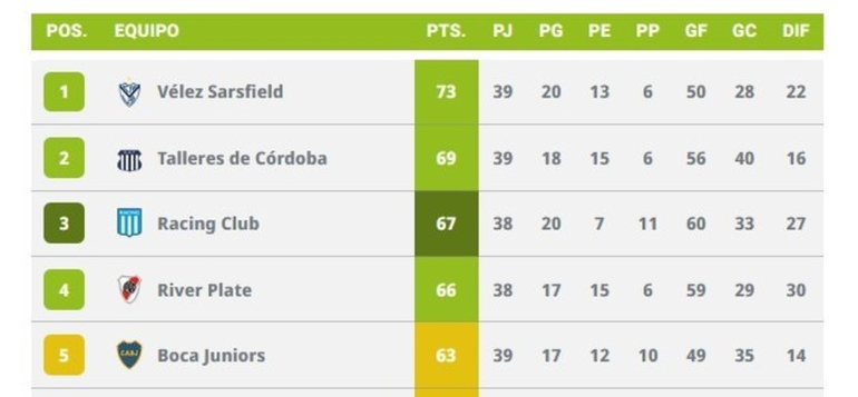 Vélez es el mejor del año con 73 puntos en 39 partidos, seguido por los 69 de Talleres de Córdoba y los 67 de Racing. Luego, aparecen inmediatamente los dos clásicos rivales más importantes del país, River con 66 y Boca con 63.