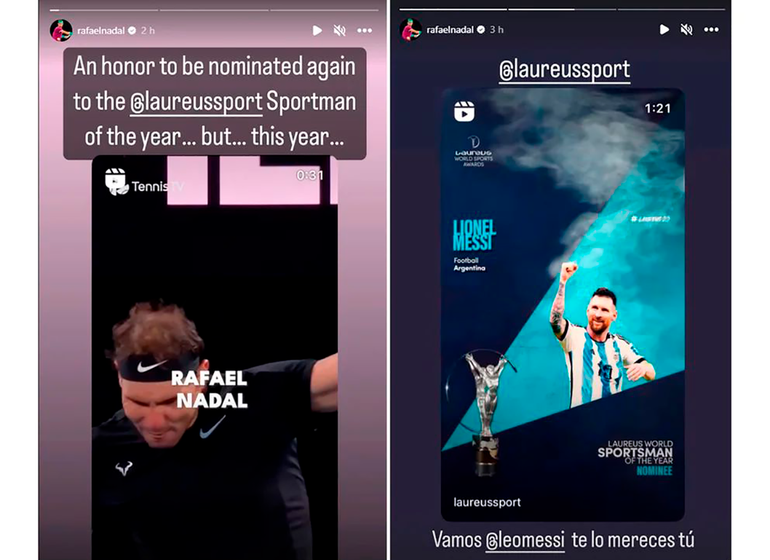 Al recibir la noticia de su nominación, Nadal se convirtió en tendencia debido a una inesperada reacción que tuvo en las redes sociales. El tenista mallorquín compartió en sus historias de Instagram el video publicado por la Academia Laureus World Sports con un sorpresivo mensaje dirigido al astro argentino.