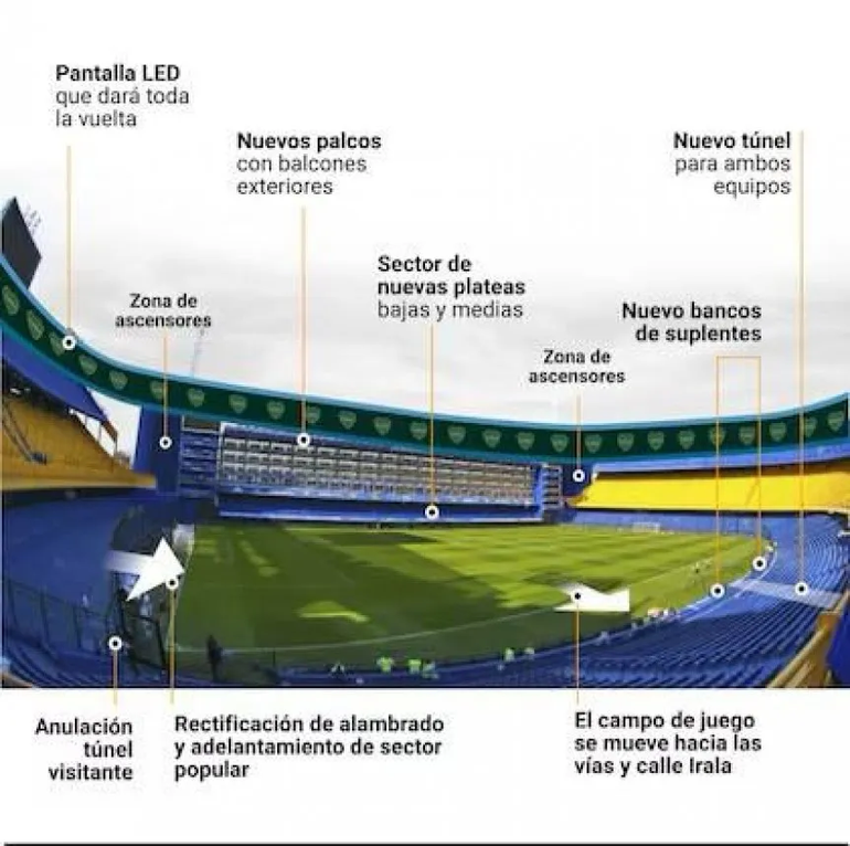 La tercera bandeja sería cubierta. Es decir, se colocaría un techo que solo cubriría esa pequeña parte y no todo el estadio. Se podrían ascensores en los codos de La Bombonera. Los bancos de suplentes se trasladarían en frente (Irala) y el túnel para la salida de los jugadores sería unificado de ese lado. Entonces, se anularía la salida para los visitantes que está ahora.