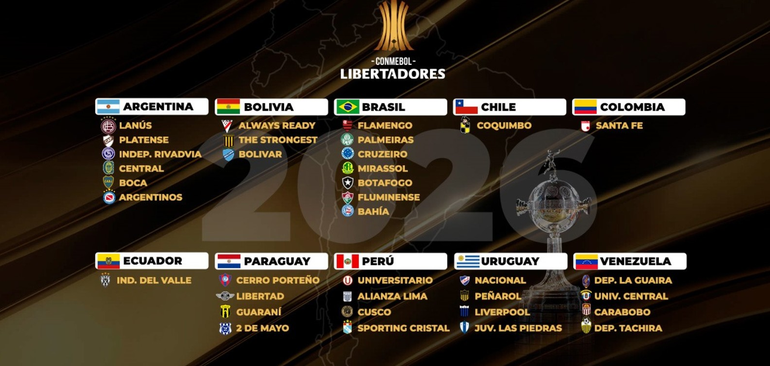 En Perú, Alianza Lima, Cusco y Sporting Cristal aguardan a la definición de un torneo que está en semis (van dos), en tanto que el representante venezolano que acompañará a Táchira saldrá de Universidad Central y Carabobo (el otro, a grupos). En Chile, el cupo de la liga saldrá muy probablemente de O'Higgins y la U, mientras que el ganador de la Copa (Huachipato o Deportes Limache) también estará.