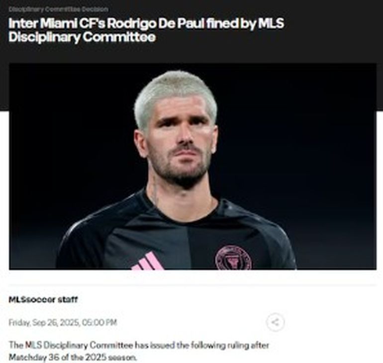 Previo al duelo ante Toronto FC en Canadá, la MLS difundió un comunicado con una sanción para el jugador: “El Comité Disciplinario ha multado con una cantidad no revelada al mediocampista de Inter Miami CF Rodrigo De Paul por violar la Política de simulación/exageración en el minuto 26 del partido de Miami contra New York City FC el 24 de septiembre”. Más allá de la multa, el jugador no fue suspendido y podrá jugar el siguiente partido.