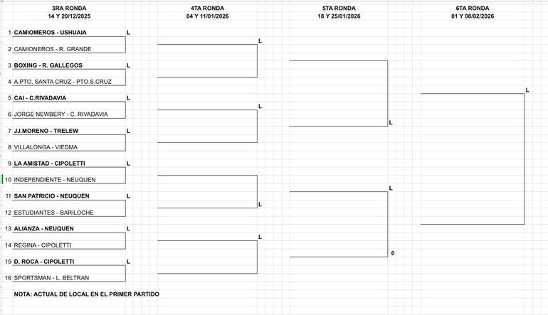 Los equipos de Lifune y Liga Confluencia integran la parte inferior del cuadro de octavos. En la parte superior están los equipos del sur patagónico.