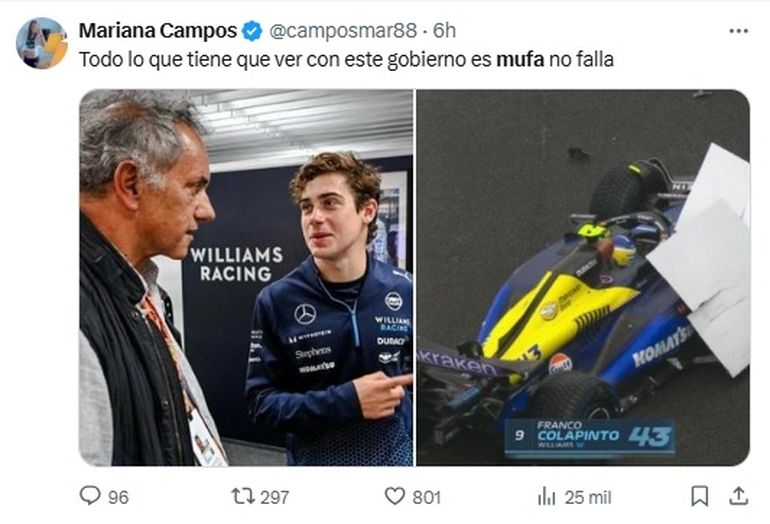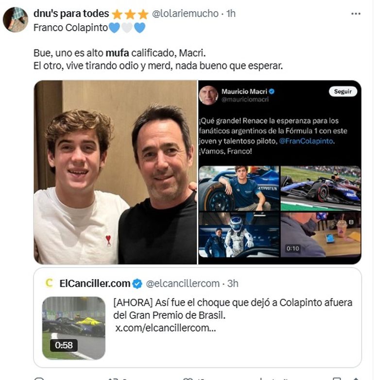 El funcionario de Milei y el empresario aliado del gobierno nacional fueron tendencia en X tras el choque del argentino en la Fórmula 1.