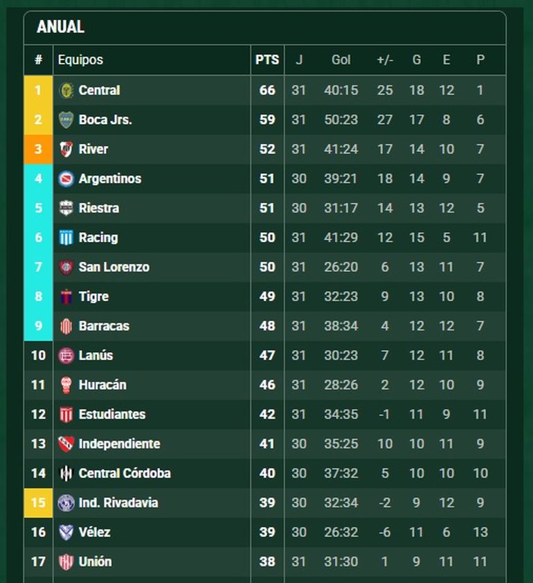 En cuanto a la Tabla Anual, con 52 puntos, el conjunto de Gallardo en estos momentos es tercero, pero puede ser superado en esta fecha por Argentinos Juniors y/o Deportivo Riestra.