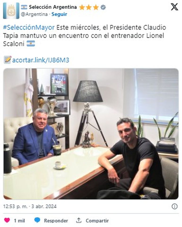 Lo cierto es que su presencia en la Copa América del corriente año entrenando a la Selección, está asegurada. Tanto es así que en abril de este año Scaloni tuvo un encuentro con el presidente de AFA Claudio Tapia: "Junto a nuestro entrenador Lionel Scaloni comenzamos la última etapa de planificación para ajustar los detalles más importantes de cara a la Copa América que se viene. ¡Vamos Scaloneta!".
