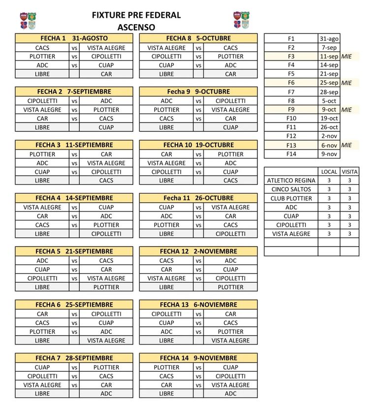 La primera fecha será: Deportivo Roca vs. Petrolero, Pacífico vs. Biguá, Pérfora vs. Centro Español e Independiente vs. Del Progreso, Cinco Saltos vs. Vista Alegre, Plottier vs. Cipolletti y Centenario vs. Unión Alem Progresista. Atlético Regina tendrá fecha libre.