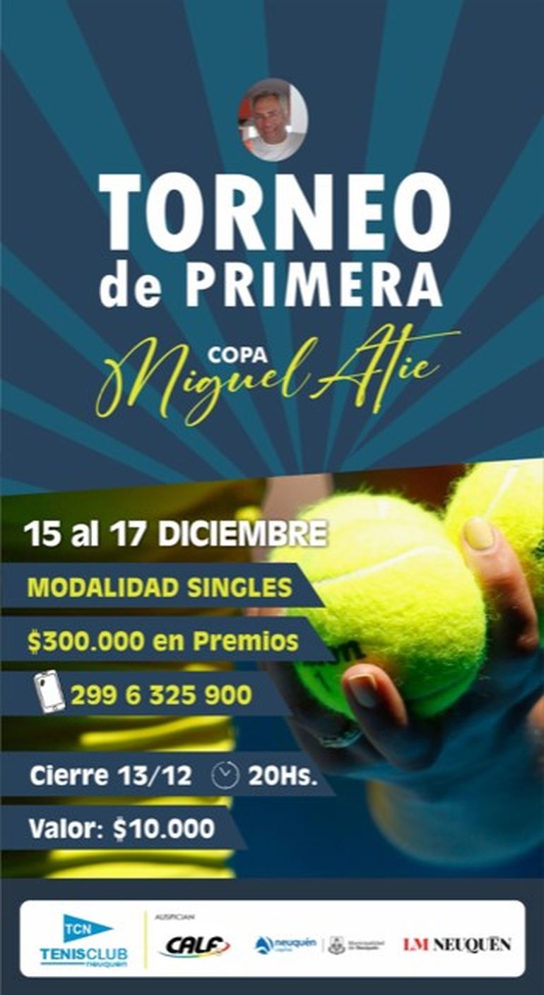 Entre el 15 y 17 de diciembre se disputará en canchas del Tenis Club Neuquén la Copa Miguel Atié, que contará con la participación de los mejores exponentes de la zona.