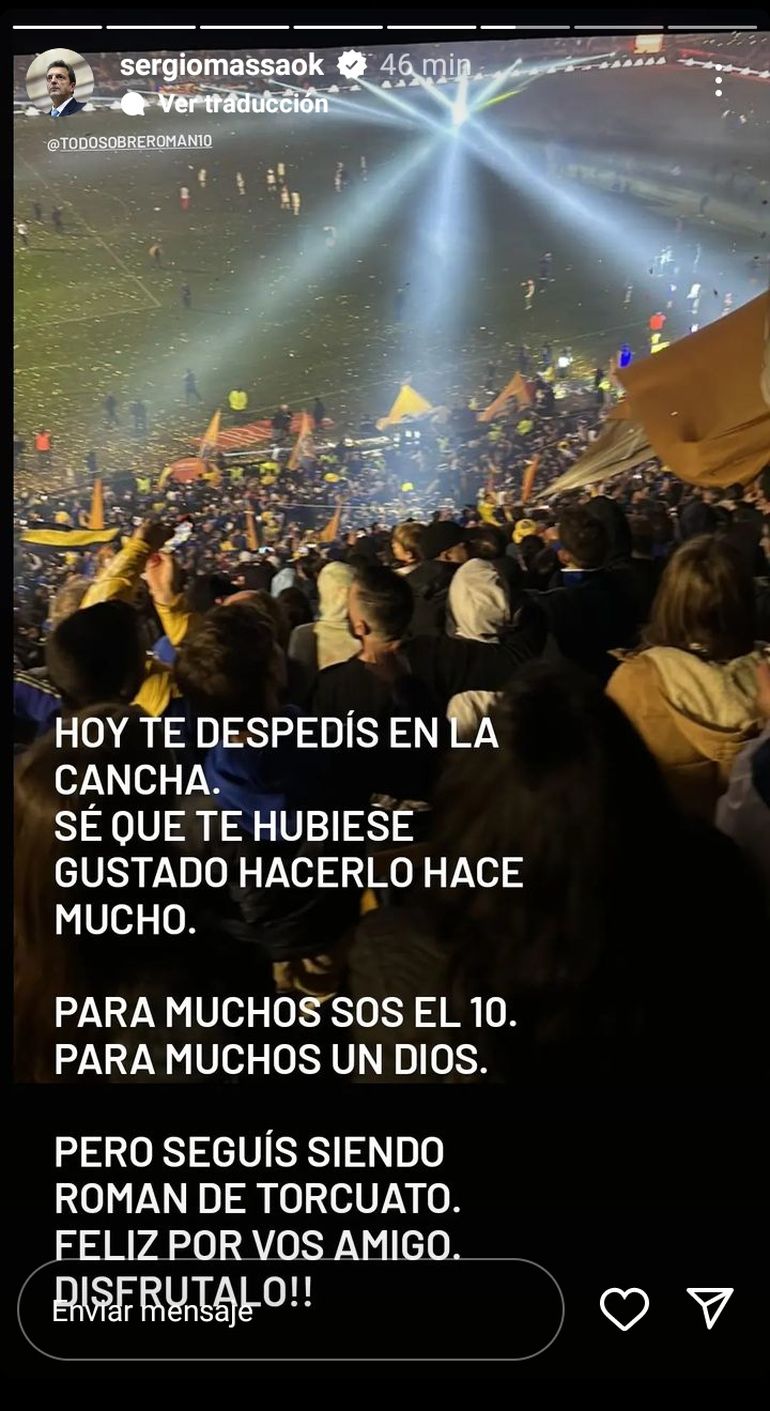 "Hoy te despedís en la cancha. Se que te hubiese gustado hacerlo hace mucho. Para muchos sos el 10. Para muchos un Dios", escribió Massa en una historia de Instagram, junto a una foto de una de las tribunas de la Bombonera en pleno homenaje. Además, el actual ministro de Economía señaló: "Seguís siendo Román de Torcuato. Feliz por vos, amigo. Disfrutalo".